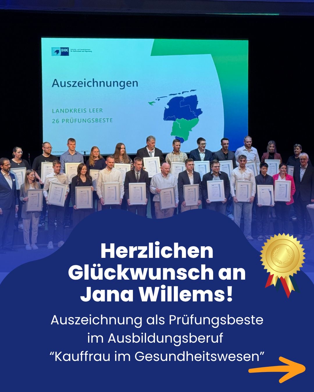 Am 30. September wurde Jana im Rahmen der feierlichen IHK-Bestenehrung im Festspielhaus am Wall in Emden für ihre hervorragenden Leistungen ausgezeichnet – gemeinsam mit den besten Absolvent*innen weiterer IHK-Ausbildungsberufe der Region Ostfriesland und Papenburg. Begleitet wurde sie dabei von ihrer Ausbilderin Elvira Klapproth, Ausbildungsleitung für kaufmännische Auszubildende am Borromäus Hospital Leer. 🏆
